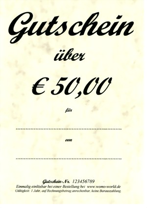 Einmalig einlösbar bei einer Bestellung bei www.womo-world.de, auf Rechnungsbetrag anrechenbar, keine Barauszahlung. Einlösungszeitraum 3 Jahre ab dem Ende des Jahres in dem der Gutschein ausgestellt wurde